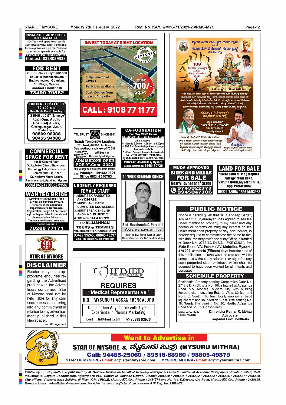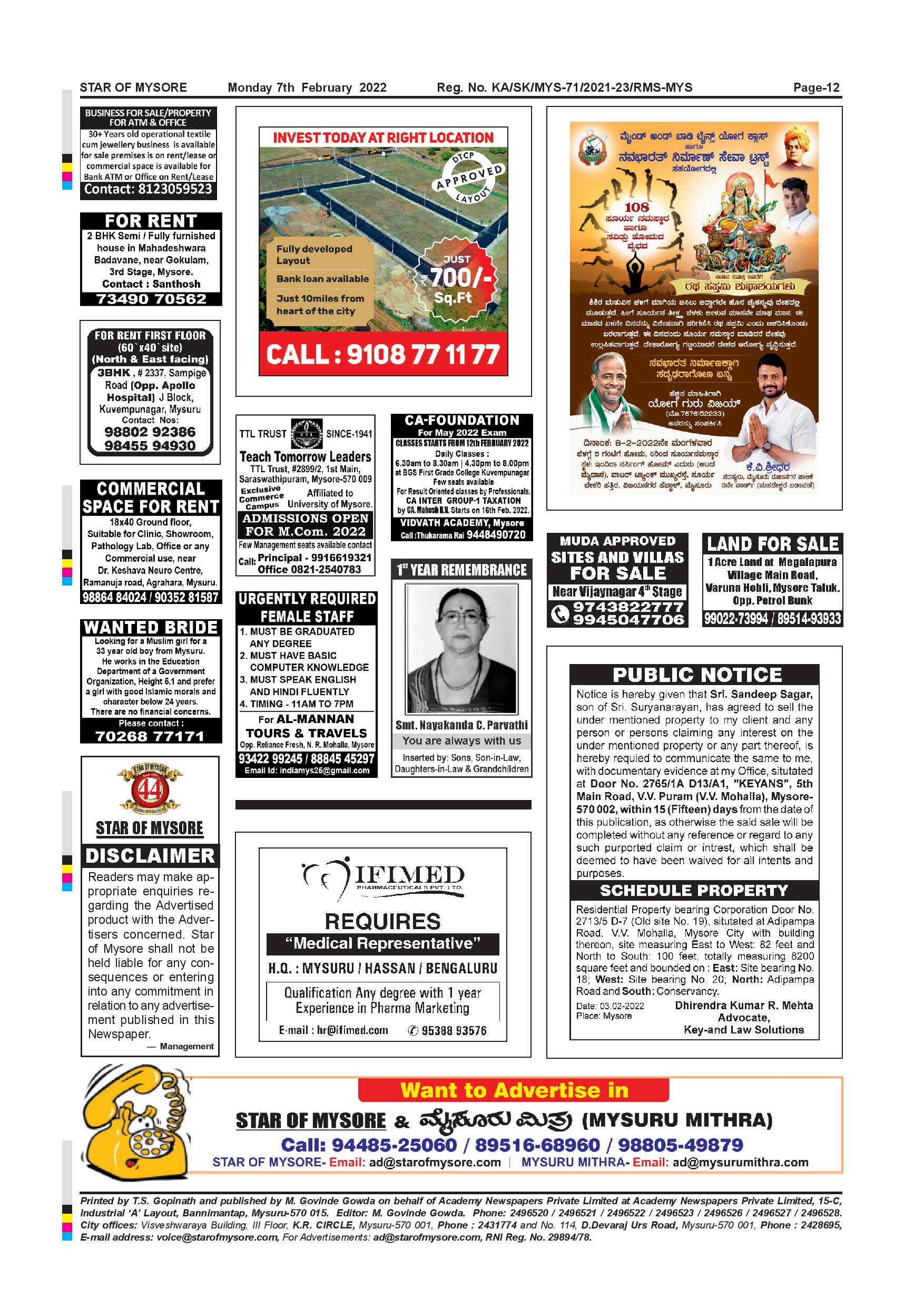 Star of Mysore Page: 12 February 07, 2022 << First << 12 >> Last >> Page 1Page 2Page 3Page 4Page 5Page 6Page 7Page 8Page 9Page 10Page 11Page 12 × Star of Mysore << First << 12 >> Last >> SOM-page-001SOM-page-002SOM-page-003SOM-page-004SOM-page-005SOM-page-006SOM-page-007SOM-page-008SOM-page-009SOM-page-010SOM-page-011SOM-page-012 SOM-page-012