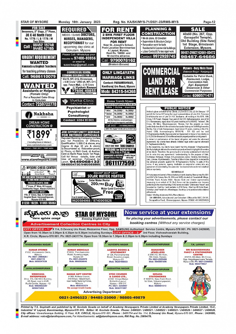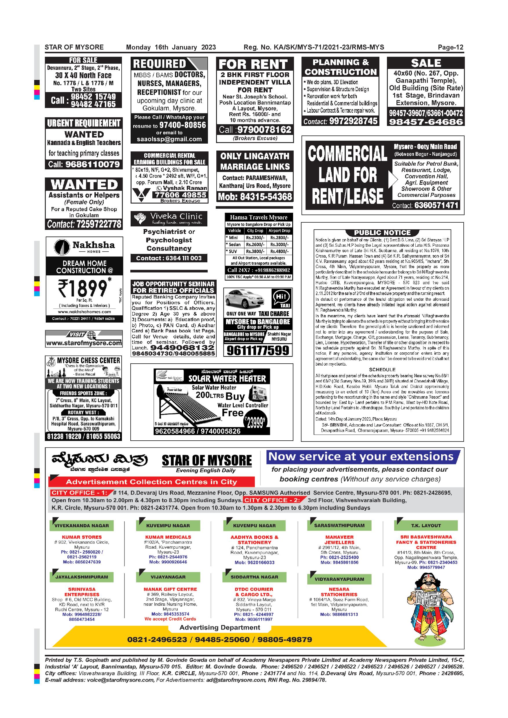 Star of Mysore Page: 12 January 16, 2023 << First << 12 >> Last >> Page 1Page 2Page 3Page 4Page 5Page 6Page 7Page 8Page 9Page 10Page 11Page 12 × Star of Mysore << First << 12 >> Last >> SOM-page-001SOM-page-002SOM-page-003SOM-page-004SOM-page-005SOM-page-006SOM-page-007SOM-page-008SOM-page-009SOM-page-010SOM-page-011SOM-page-012 SOM-page-012