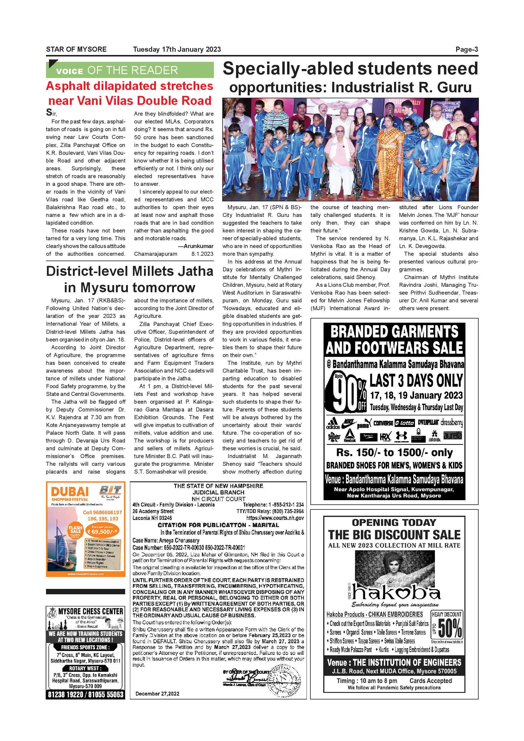 Star of Mysore Page: 3 January 17, 2023 << First << 3 >> Last >> Page 1Page 2Page 3Page 4Page 5Page 6Page 7Page 8Page 9Page 10Page 11Page 12 × Star of Mysore << First << 3 >> Last >> SOM-page-001SOM-page-002SOM-page-003SOM-page-004SOM-page-005SOM-page-006SOM-page-007SOM-page-008SOM-page-009SOM-page-010SOM-page-011SOM-page-012 SOM-page-003