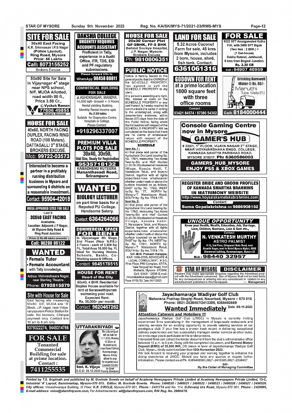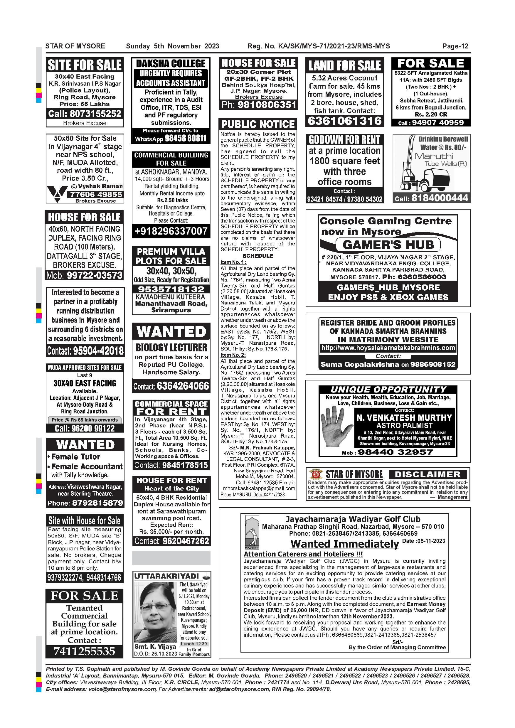 Star of Mysore Page: 12 November 05, 2023 << First << 12 >> Last >> Page 1Page 2Page 3Page 4Page 5Page 6Page 7Page 8Page 9Page 10Page 11Page 12 × Star of Mysore << First << 12 >> Last >> SOM-page-001SOM-page-002SOM-page-003SOM-page-004SOM-page-005SOM-page-006SOM-page-007SOM-page-008SOM-page-009SOM-page-010SOM-page-011SOM-page-012 SOM-page-012