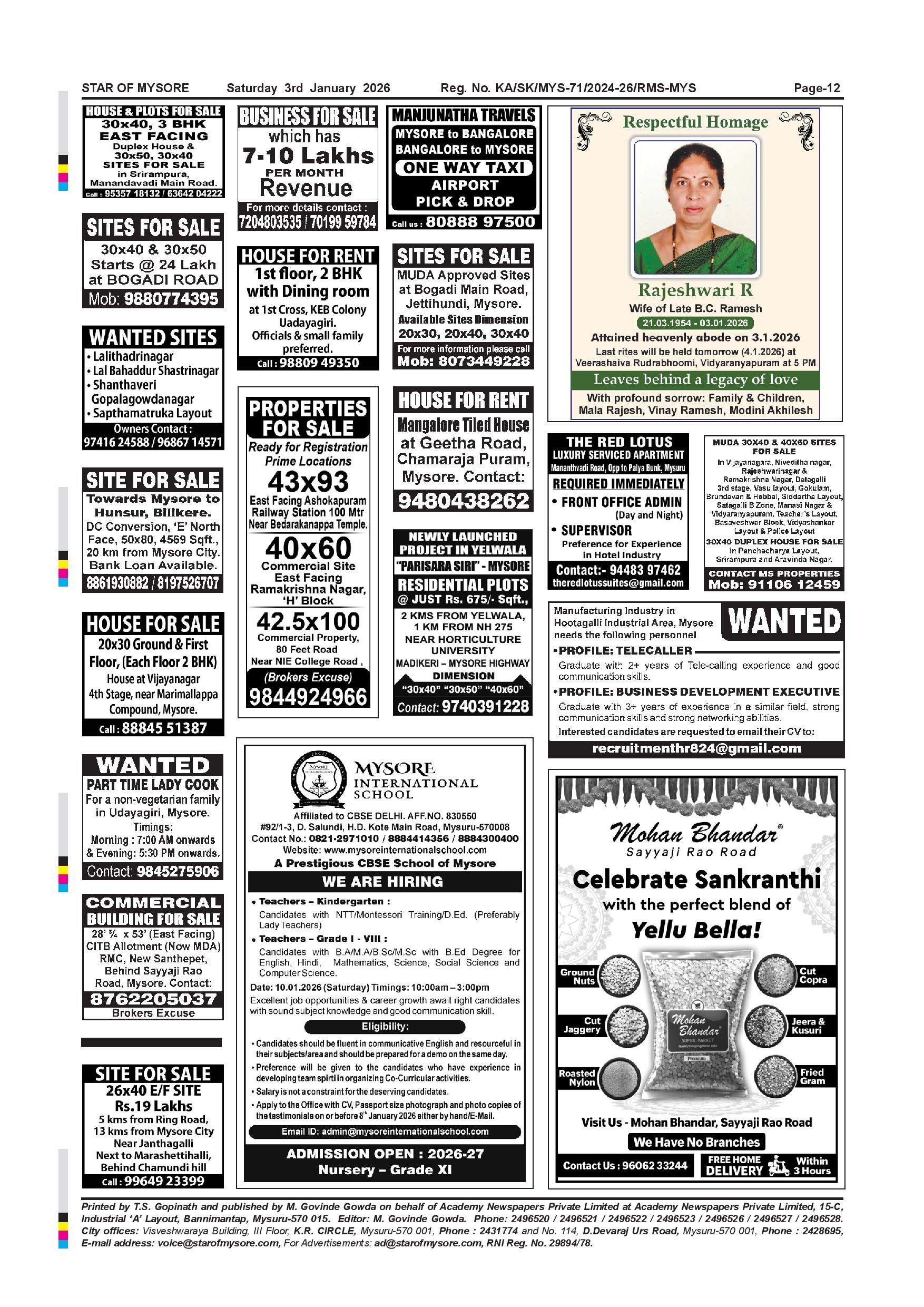 Star of Mysore Page: 12 January 03, 2026 << First << 12 >> Last >> Page 1Page 2Page 3Page 4Page 5Page 6Page 7Page 8Page 9Page 10Page 11Page 12 × Star of Mysore << First << 12 >> Last >> Jan-3-page-001Jan-3-page-002Jan-3-page-003Jan-3-page-004Jan-3-page-005Jan-3-page-006Jan-3-page-007Jan-3-page-008Jan-3-page-009Jan-3-page-010Jan-3-page-011Jan-3-page-012 Jan-3-page-012